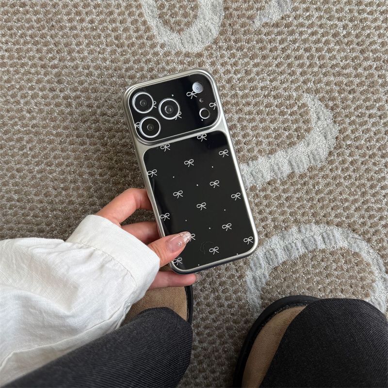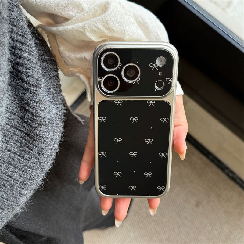 - Design: A glossy black back with white ribbon/bow illustrations and a contrasting silver-toned or metallic rim around the camera module and edges, giving it a premium feel.